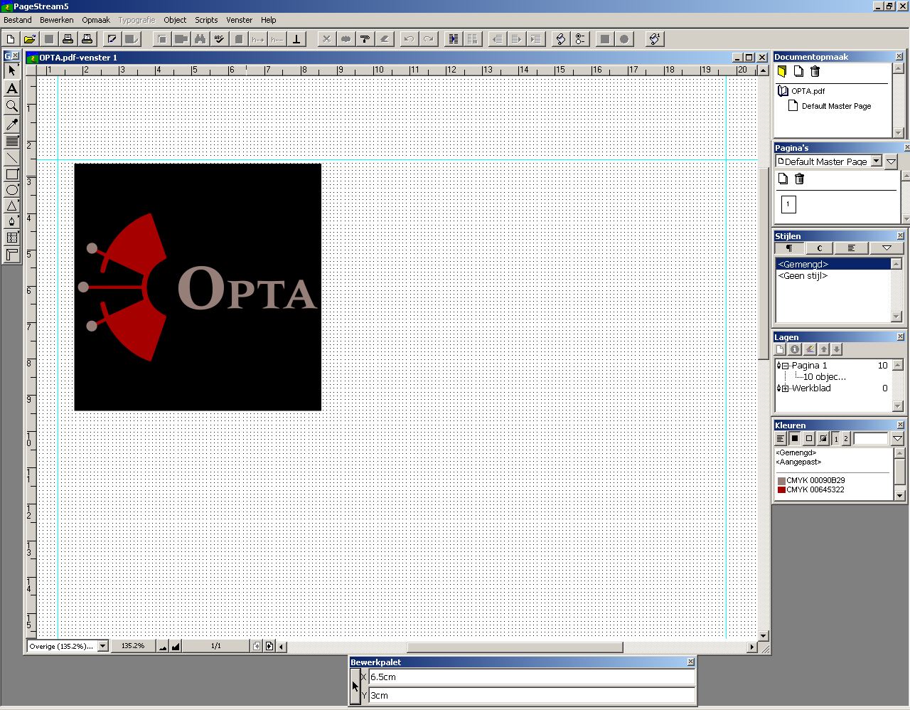 Opening a PDF with a drawing (vector based) in PGS gives the wrong colors, because it imports the amounts (percentages) of color in CMYK and not in RGB. C is somehow always 0. When placing the color values in the right color mode (RGB), the colors are correct. Remark: this bug is an old one, meaning it was already in older versions of (Windows) PGS. First found this in February 2007. | |