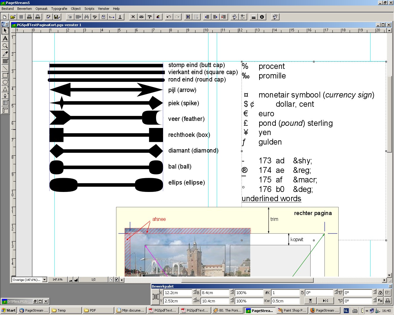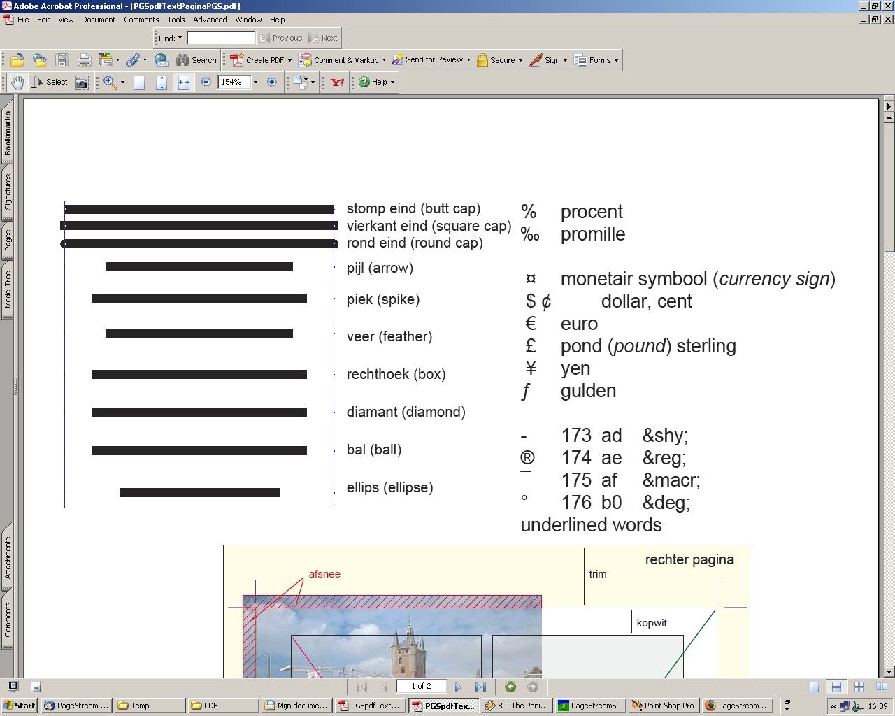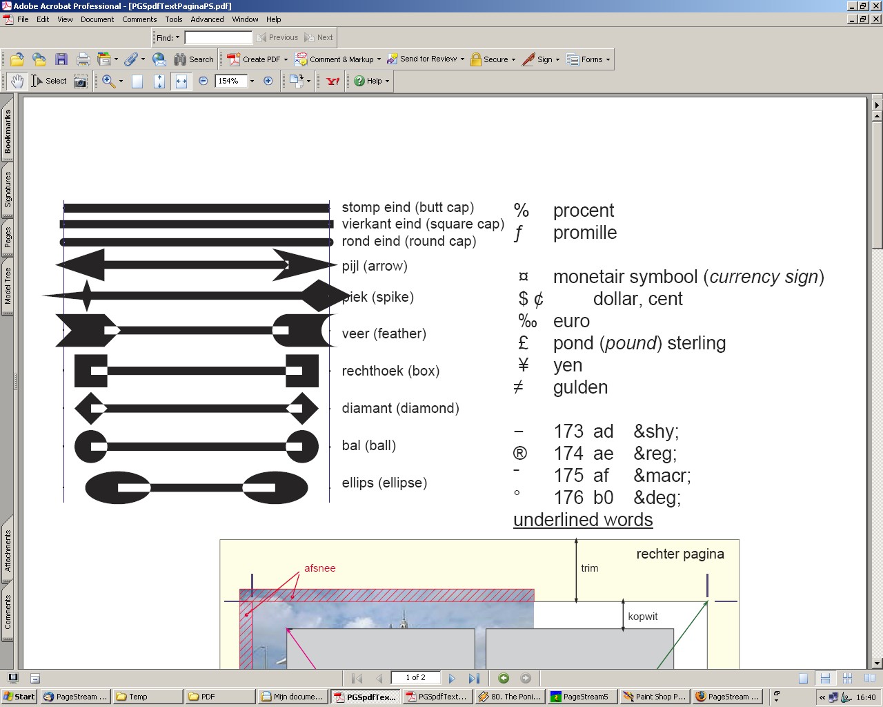 I just checked the PDF making of PGS 5.0.4.34 itself (not PGS -> PS -> PDF, because this PGS crashes. And this has nothing to do with PDF or PS making, but the document - and consequently all others open as a collapsed window - opens at the most right bottom. And I cannot make this as a normal document window: only collapsed or full screen. And somehow this trying does crash PGS). The ends are more or less correct, only they have small holes (white) in them. The lines with arrows in the PDF are longer than in PGS. The lines horizontal and with an angle have the same thickness. All the characters are displayed correct. All the colors from the ilus are in PDF much better than before. A lot of work done! Very good Deron! | |